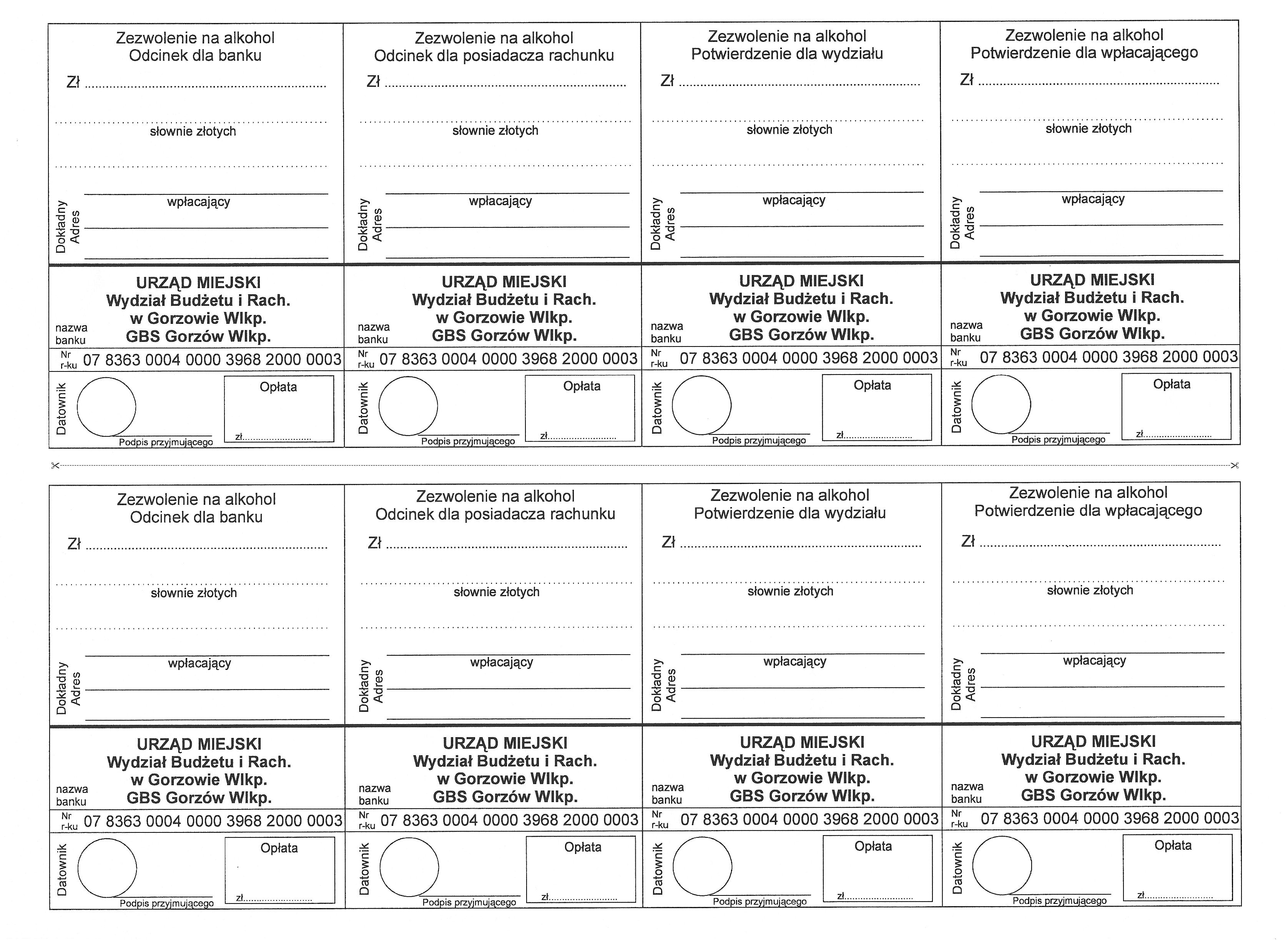 Opłata wnoszona jest na rachunek Miasta Gorzowa Wlkp. podany wyżej przed wydaniem zezwolenia w wysokości odpowiadającej 1/12 rocznej opłaty za poszczególne rodzaje zezwoleń.